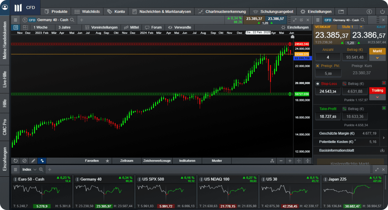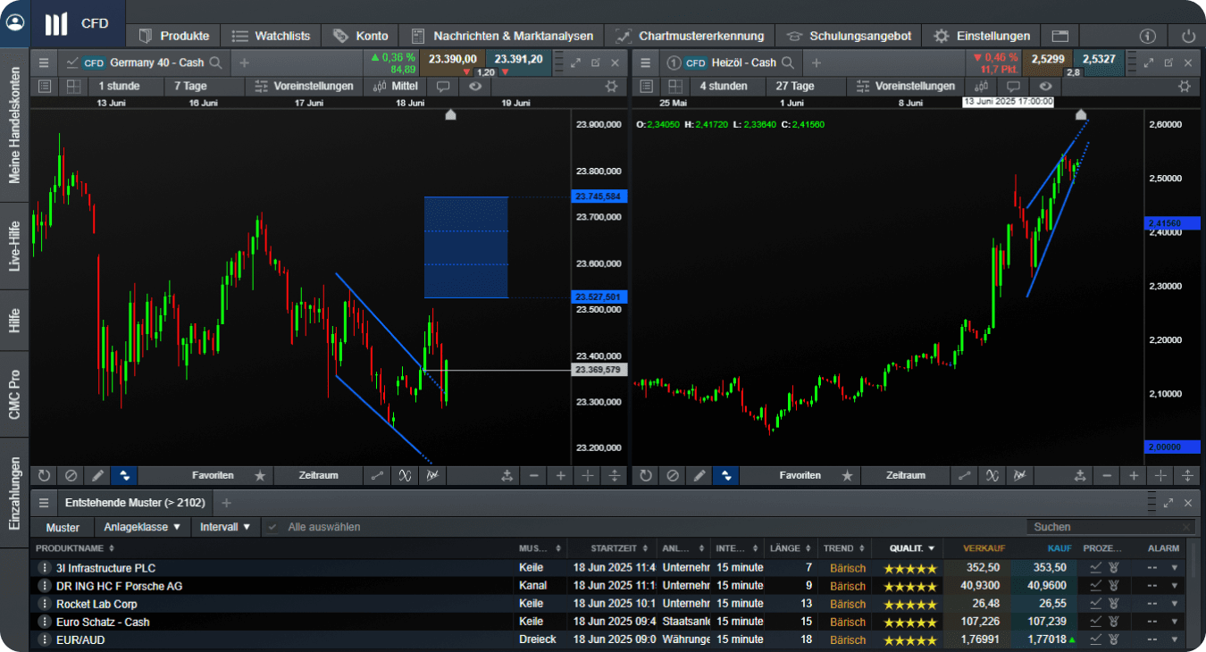 3 Die Chartmustererkennung dient nur zur allgemeinen Information und stellt keine Trading- oder Anlageberatung dar. Wir übernehmen keine Gewährleistung für die Genauigkeit, Vollständigkeit oder Pünktlichkeit der Daten. Alle Analysen, sich ergebenden Schlussfolgerungen und Beobachtungen bei Chartmuster-Erkennung basieren auf historischen Chart-Informationen und Mustern, die ihrerseits wiederum auf historischen Handelsdaten von CMC Markets beruhen und nicht auf Daten im Zusammenhang mit dem/den letztendlich zugrunde liegenden Instrument(en). Bitte beachten Sie, dass die in unseren Charts angezeigten Kurse in der zugrunde liegenden Währung des jeweiligen Instruments angegeben sind. Alle Informationen bezüglich vergangener Performance eines Produktes stellen keine Garantie für zukünftige Performance dar. Die Nutzung von Charting-Daten hat ihre Grenzen, und Sie sollten nicht allein auf der Grundlage dieser Daten entscheiden (oder sich dadurch bei der Bestimmung leiten lassen), welches Instrument Sie kaufen oder verkaufen.