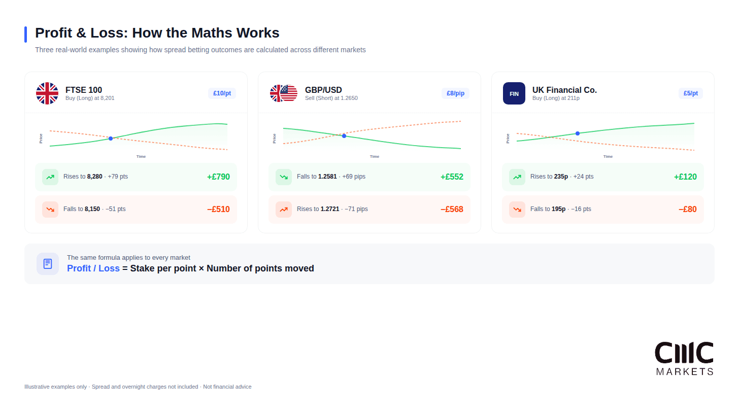 Scenario A – Market rises to 8,280: You close at 8,280. Points gained: 79. Profit: £790.