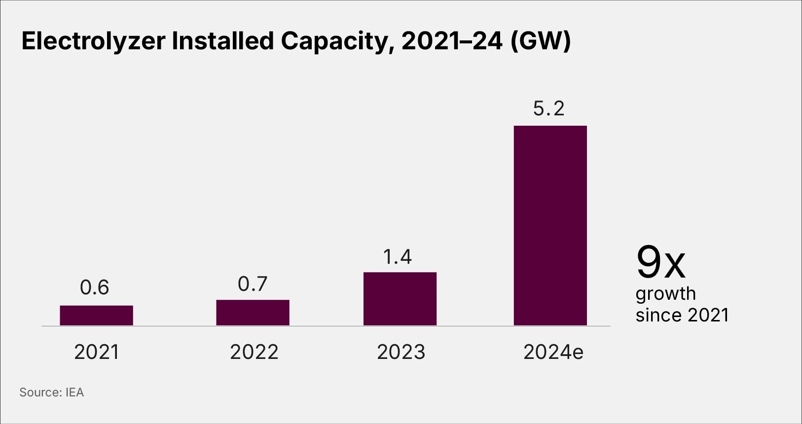 In its Global Hydrogen Review 2024, the IEA forecast that electrolyzers with a combined capacity of 5.2GW would be installed by the end of the year, compared to 0.6GW in 2021, as shown in the graph below.