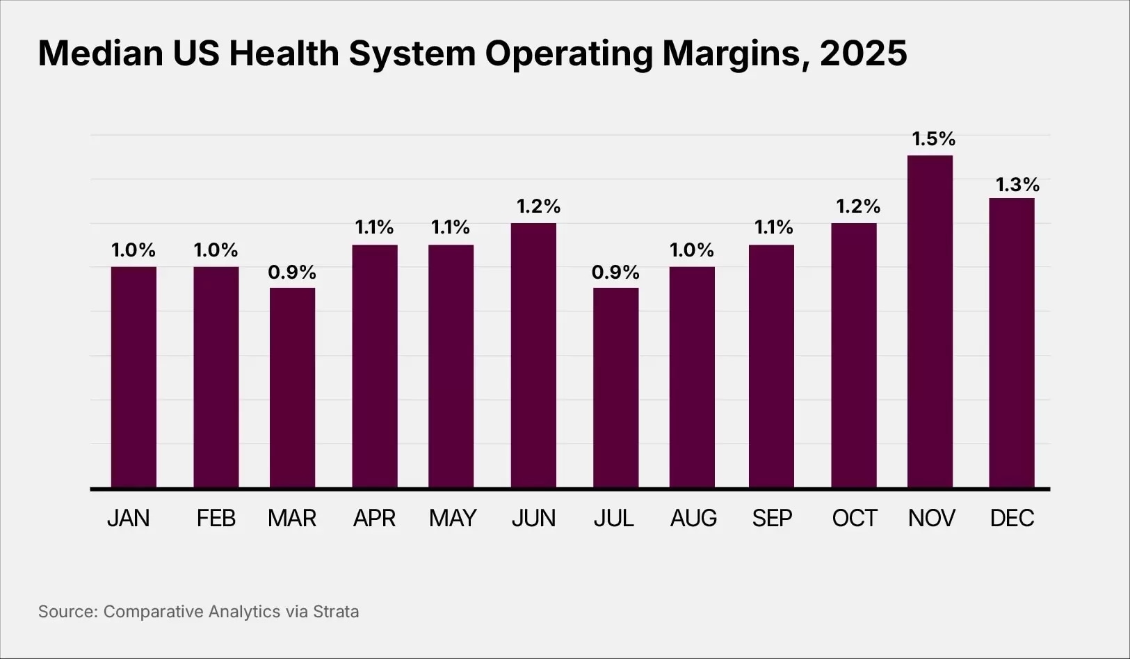 While operating margins have rebounded from negative values during the Covid-19 pandemic, the median figure for US hospitals was 1.3% in December 2025, down from 1.5% in November but up from 1% at the start of the year. As the graph below shows, hospitals recorded relatively stable operating margins in 2025, but the compressed figures point to rising expenses.
