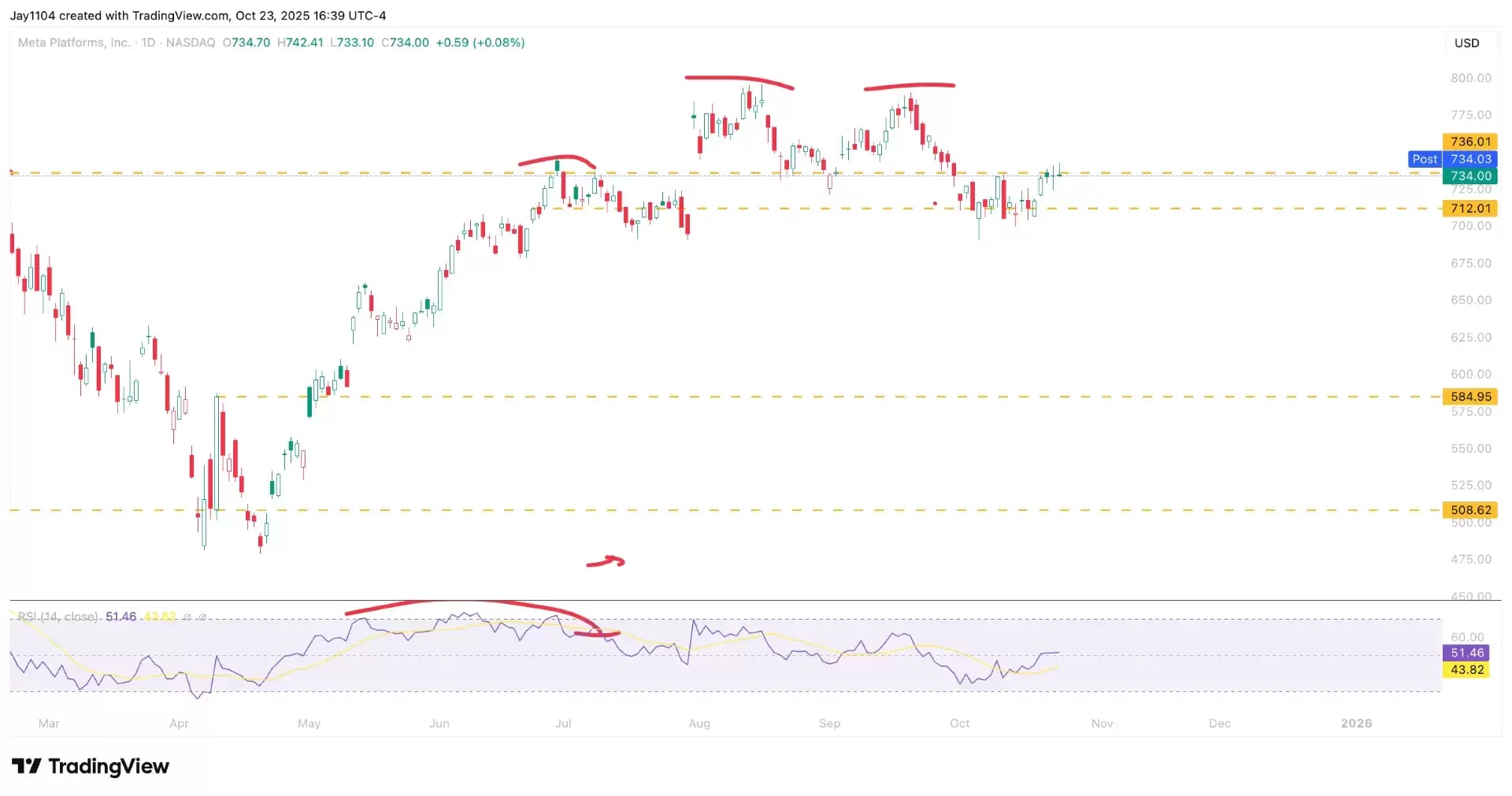 Meta may have formed a double-top pattern, with the neckline situated between $715 and $736. At present the stock is trading near the upper end of that range, around $736, suggesting that exceptionally strong earnings and favourable guidance might be required to propel it meaningfully above $750. Additionally, Meta’s relative strength index (RSI) has been trending lower, signalling a potential bearish divergence. A break below $712 would confirm the double-top formation and a break of the neckline, potentially paving the way for a decline towards the $675–$650 range.