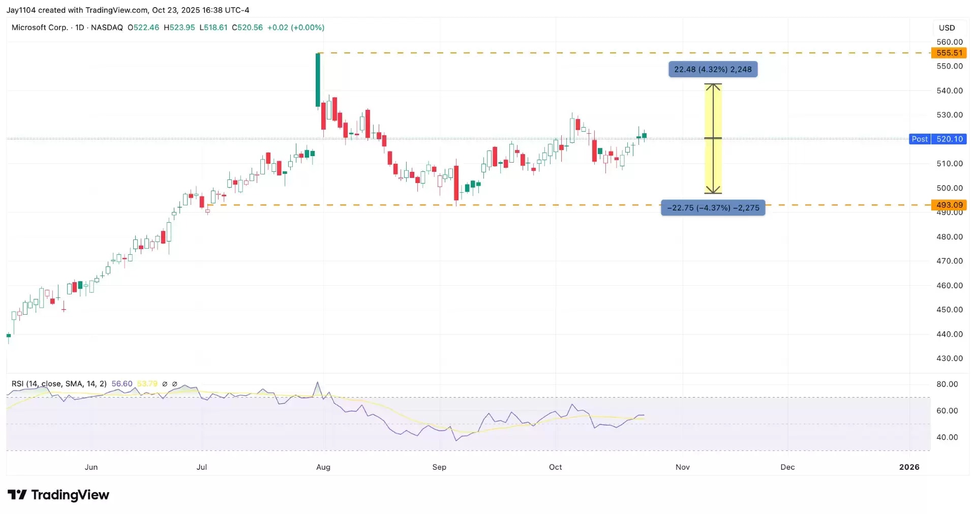 The stock is expected to move by around 4.3% following the results. Options positioning appears mixed, with support around $510 and resistance near $550. The technical charts show that the shares have traded largely sideways since the company last reported results in July, with little directional momentum. Based on the implied post-earnings move, the stock may remain in this trading range even after the results.