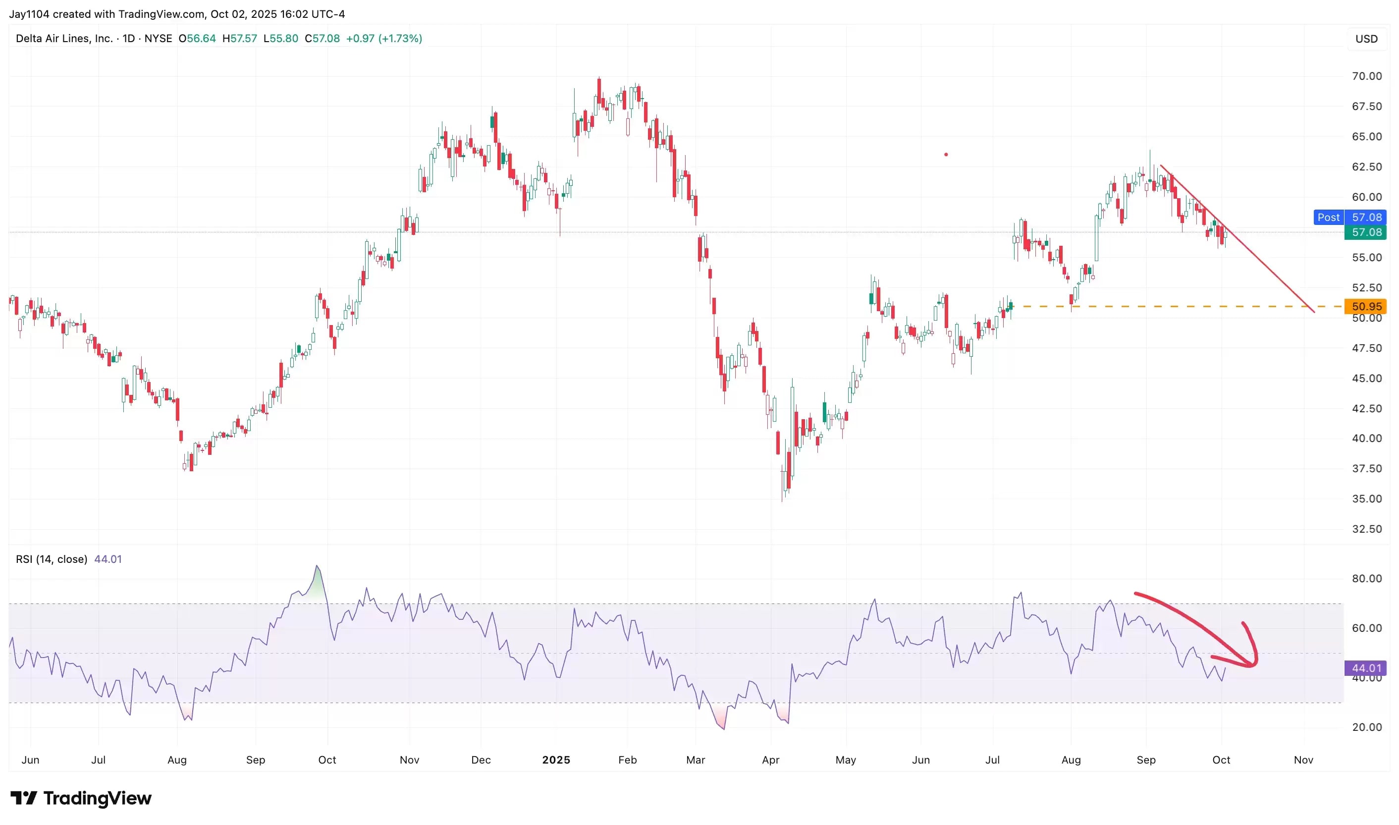 Technical trends indicate a more bearish outlook, as the below chart illustrates. The S&P 500 constituent's stock price is in a clear downtrend and the RSI is also trending lower. Based on momentum and the prevailing trend, it seems possible that Delta’s shares may continue to decline following the results, unless the company delivers better-than-expected earnings or guidance. The next area of support lies around $50, a level that dates back to July and coincides with the large put gamma concentration.