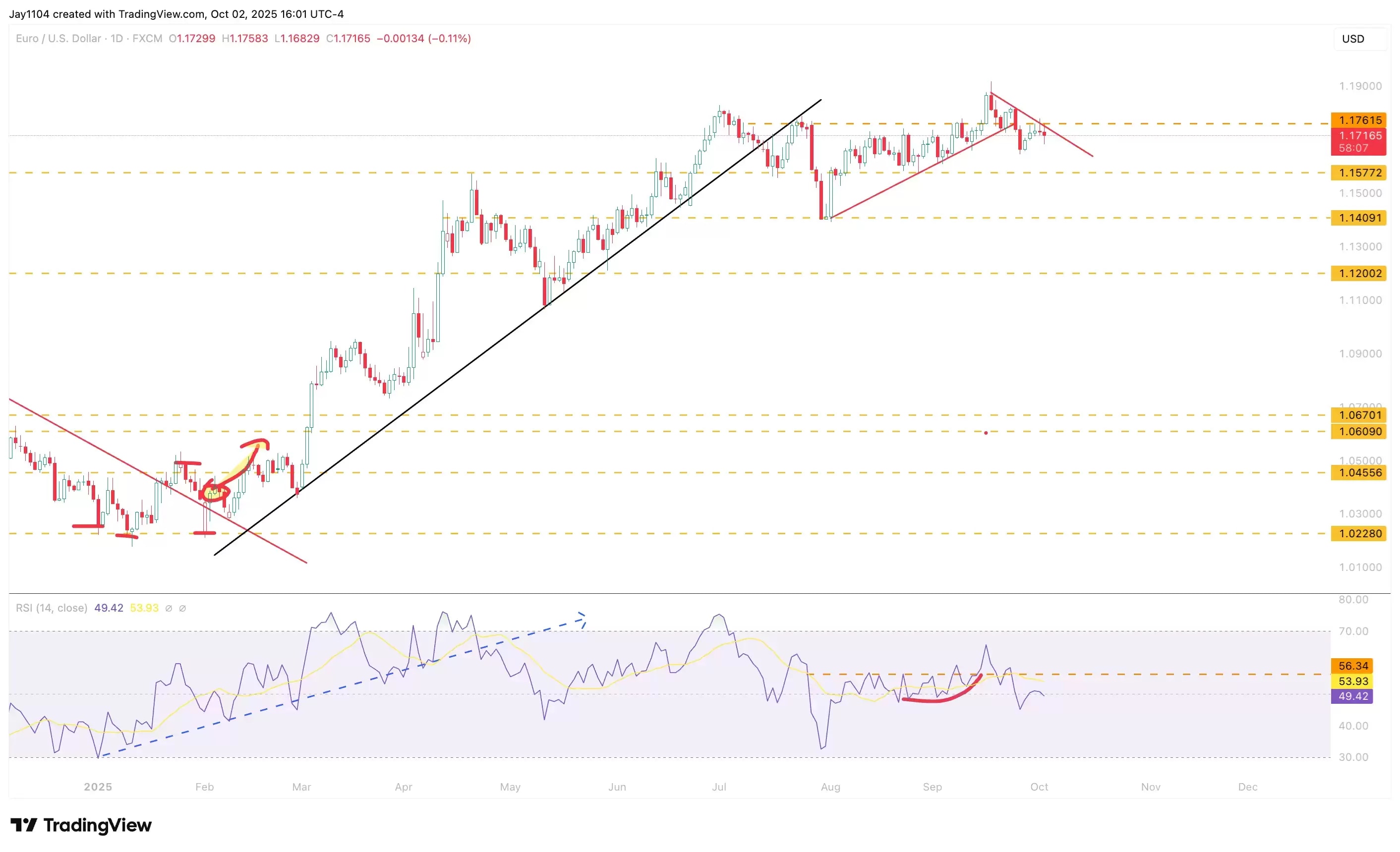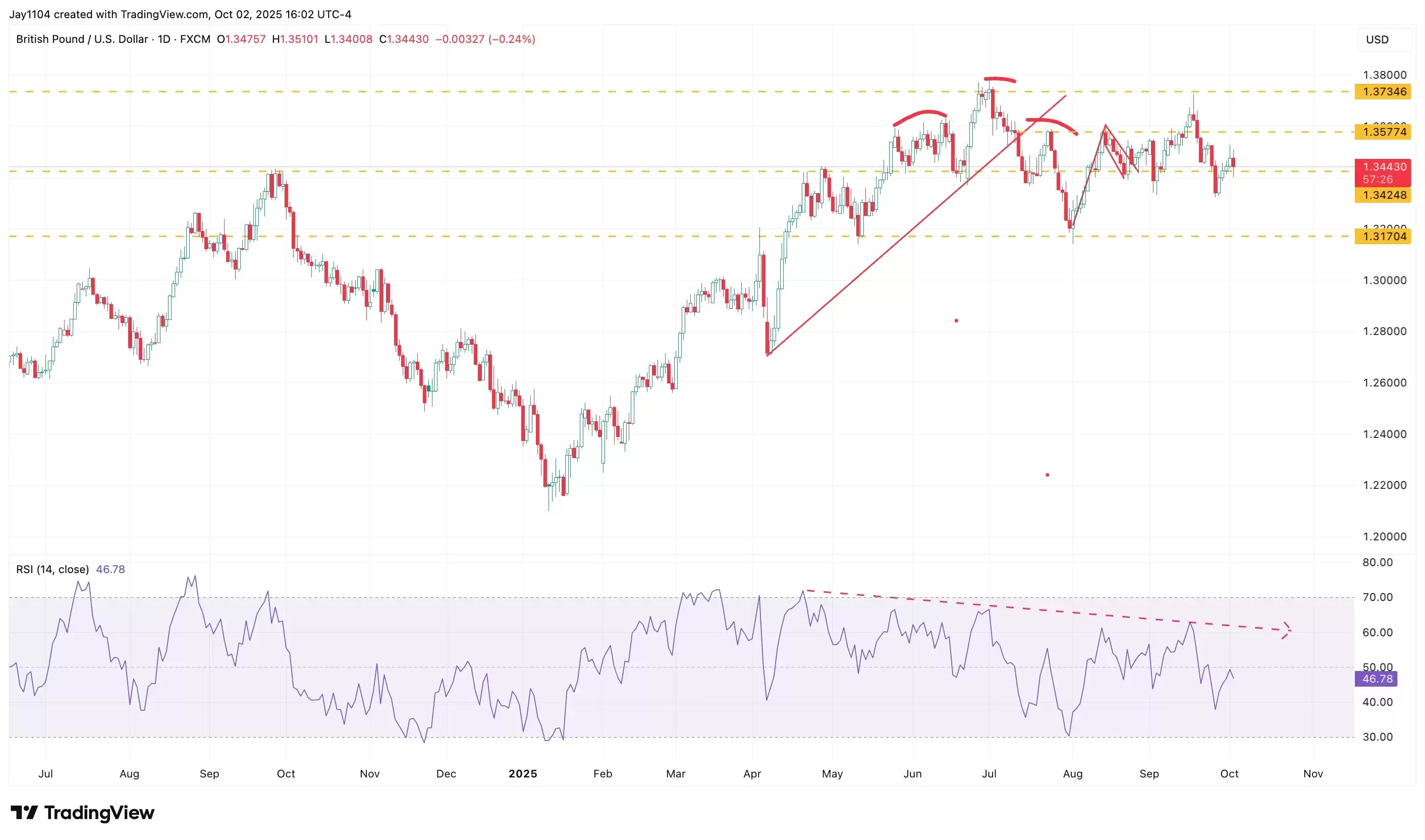 Whatever positive momentum the pound had from August to early September, as recorded by a rise in GBP/USD’s RSI during that period, now appears to have faded. The RSI has resumed its downtrend, indicating that momentum has turned bearish. Currently, the pound is holding onto support around $1.34. A break below this level could see GBP/USD weaken towards $1.317, which has acted as support on two occasions in 2025.