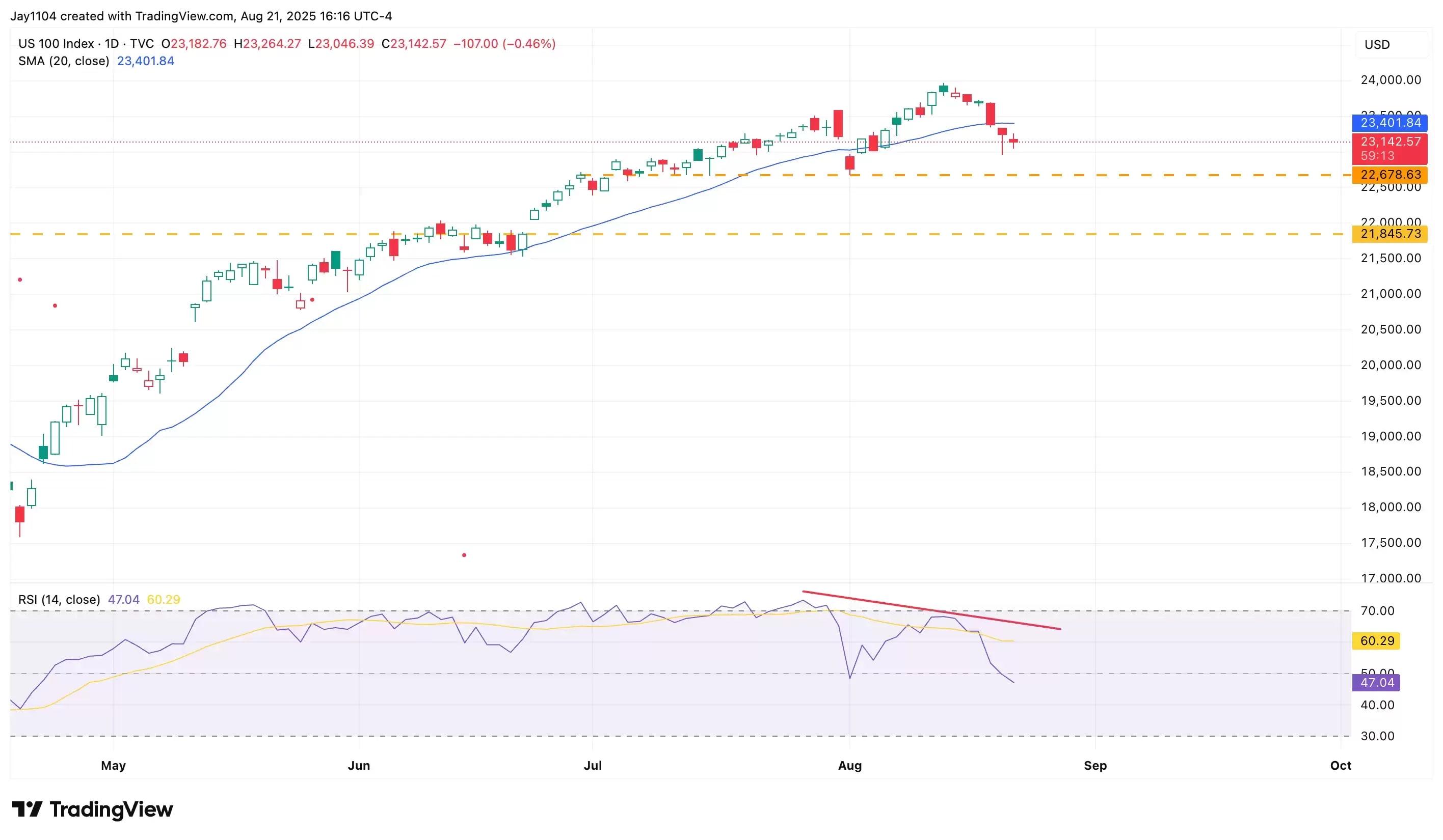 The Nasdaq 100 traded below its 20-day simple moving average (the blue line on the chart below) for two consecutive days in August – the first time this has happened since April. In addition, a bearish divergence has formed, with the RSI making a lower high this month while the Nasdaq 100 itself recorded a higher high. If the tech-heavy share index is indeed about to dip, support sits at around 22,780. A break below that level could see the index slump towards 21,850, filling an open gap.