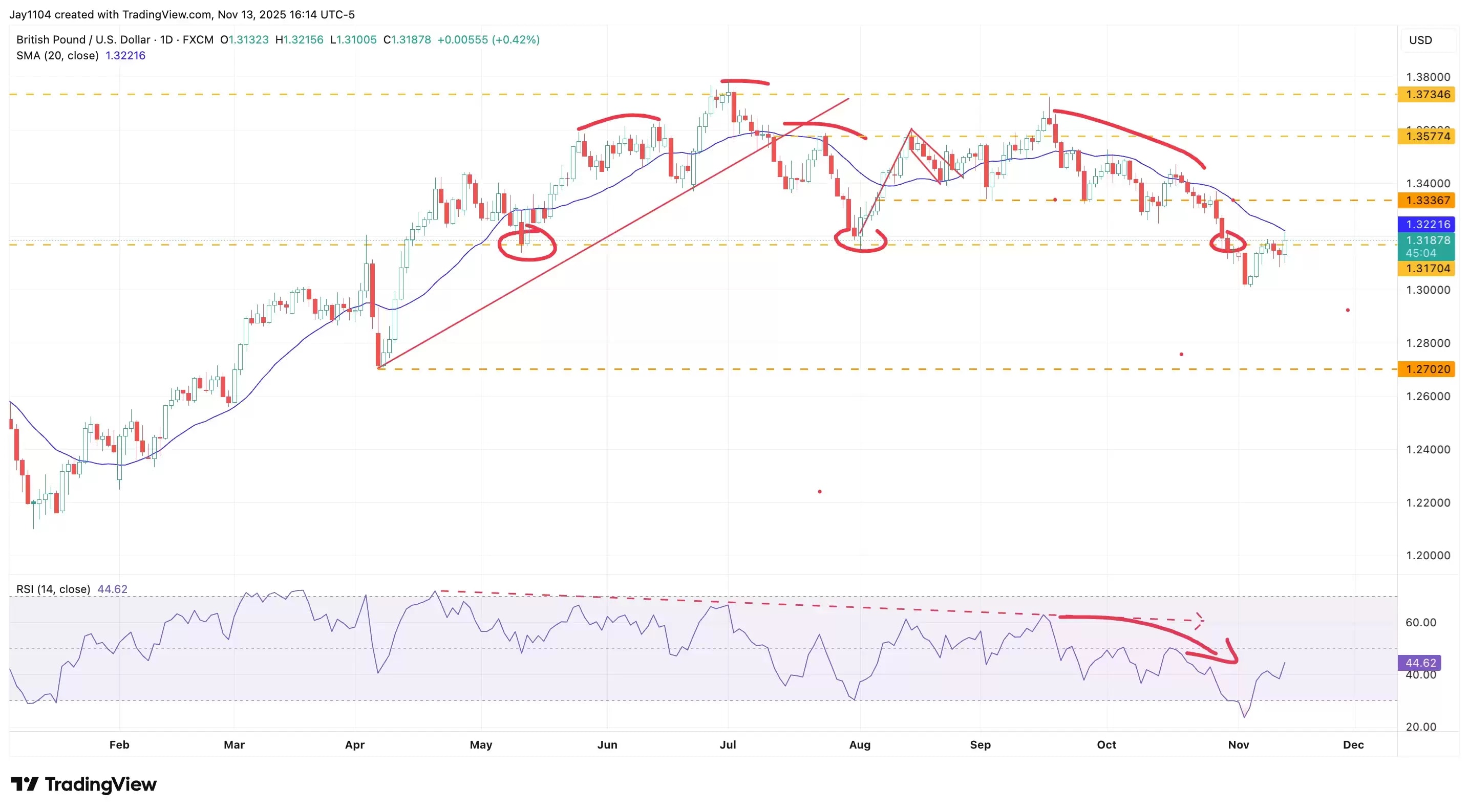 A rate cut could put further pressure on the pound, with GBP/USD already struggling to break back above resistance at $1.3170. If the pair manages to clear that level, it could rise towards $1.33. However, if an in-line or cooler-than-expected CPI reading locks in market expectations of a December rate cut, there is potential for the pound to slip from current levels towards $1.27, a rate not seen since early April.