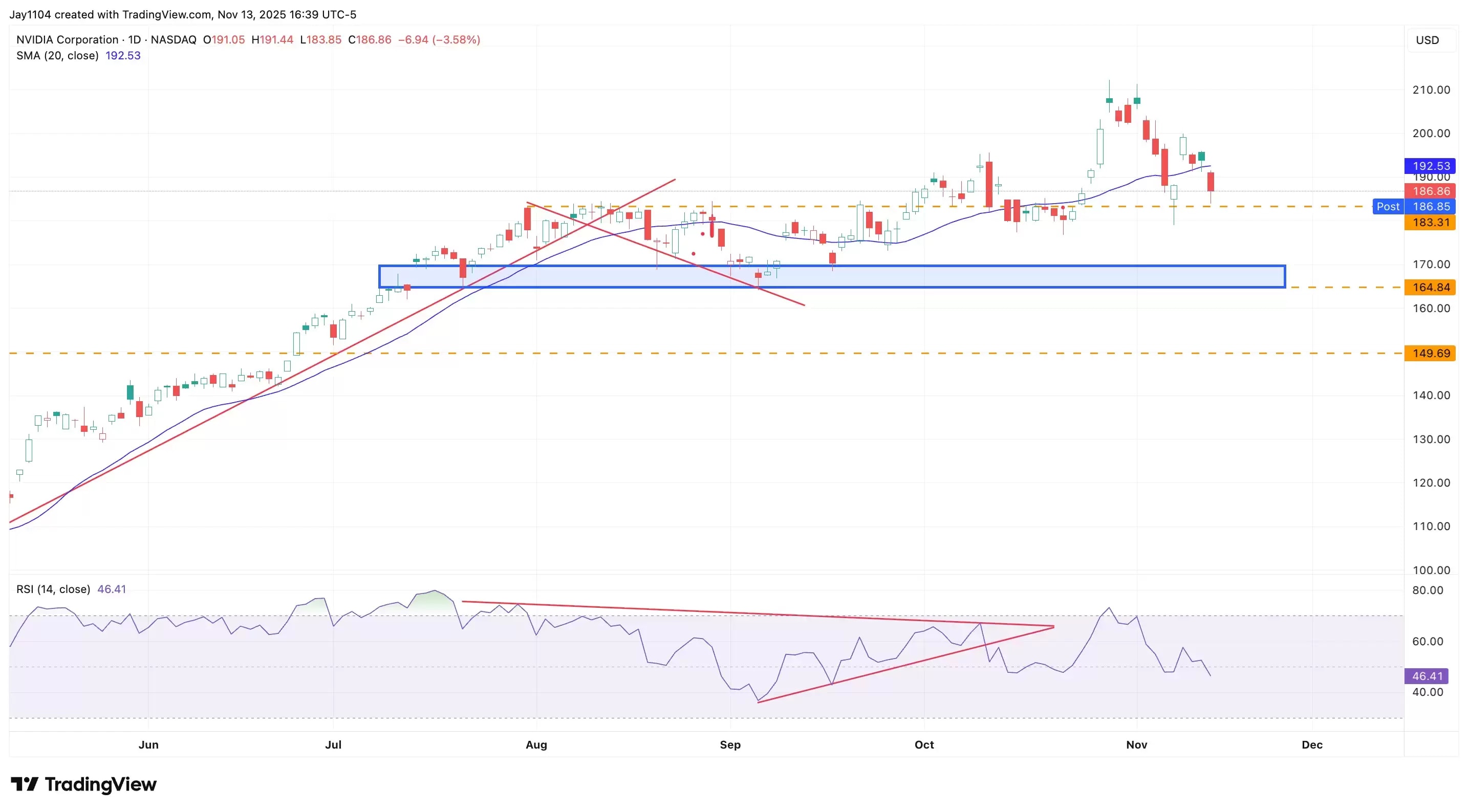 Technical analysis indicates that the Nvidia share price has been holding above a support level around $183, which also aligns with an important options-related support zone at $185. But if the stock moves lower after the results, there is a chance it could fall to around $165 (the area highlighted by the blue bar on the below chart), as that is the next major technical support level. Momentum, as indicated by the relative strength index (RSI) is weakening and trending lower – it’s at about 46 at the time of writing. Meanwhile, the lower Bollinger Band is currently around $175. Taken together, these indicators suggest that there may be ample room for the shares to fall following the results to between $165 and $175.