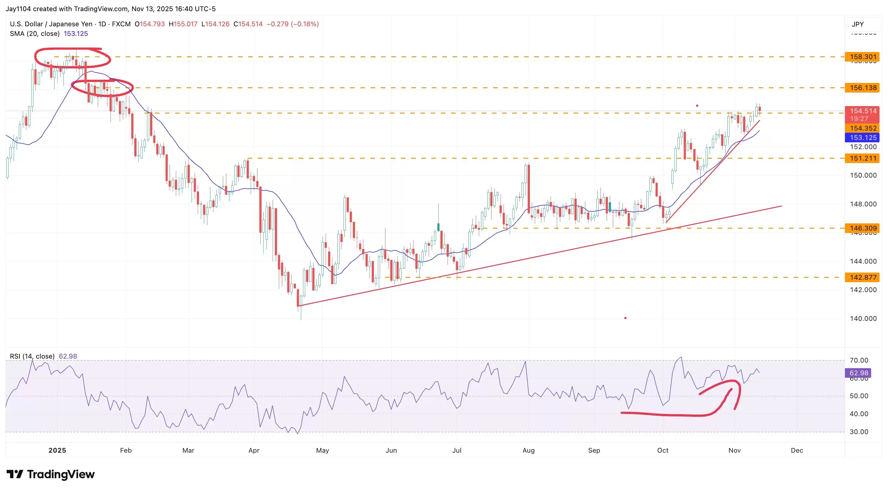 The yen appears to be at a crucial turning point as it tests resistance near ¥154.5 per dollar. Technical analysis suggests that the yen may be set to weaken further, potentially sending USD/JPY towards ¥156.14, or even ¥158.30 if the CPI reading comes in hotter than expected and the BoJ offers no signal that it plans to raise interest rates any time soon.