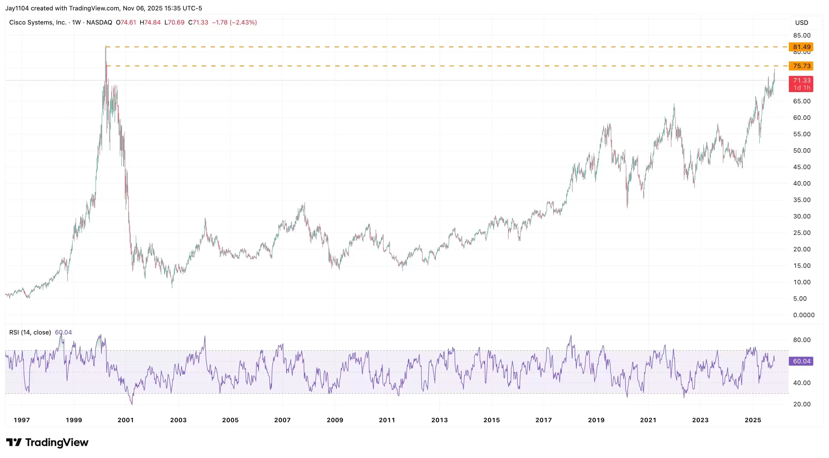 Cisco Systems share price, 1997-2025