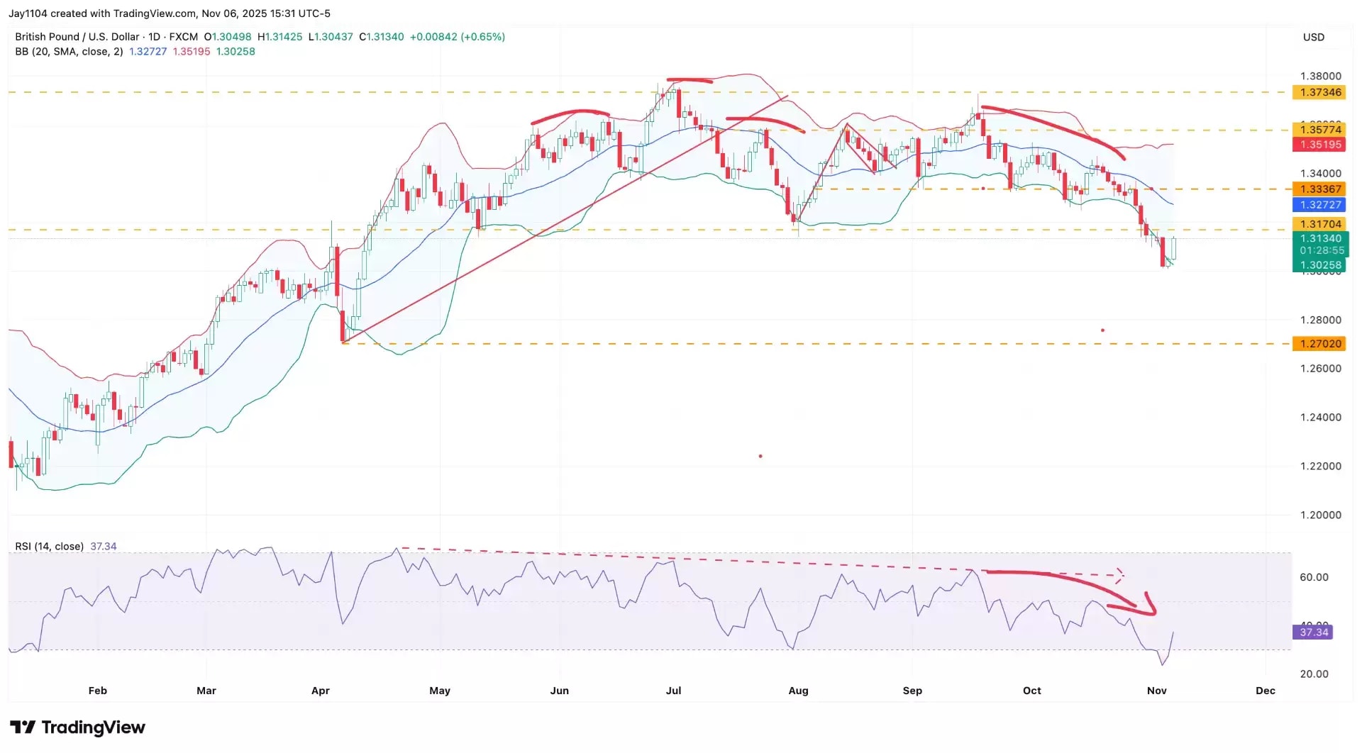 Recently, the pound fell below support at $1.31 and has since been consolidating sideways, which is to be expected given its oversold condition with the relative strength index (RSI) dropping below 30, and the currency trading beneath its lower Bollinger Band. However, weaker data may lead to further declines and additional weakness against the dollar. Conversely, stronger data could allow the pound to rebound and retest resistance around $1.3160, although a breakout above resistance appears unlikely.