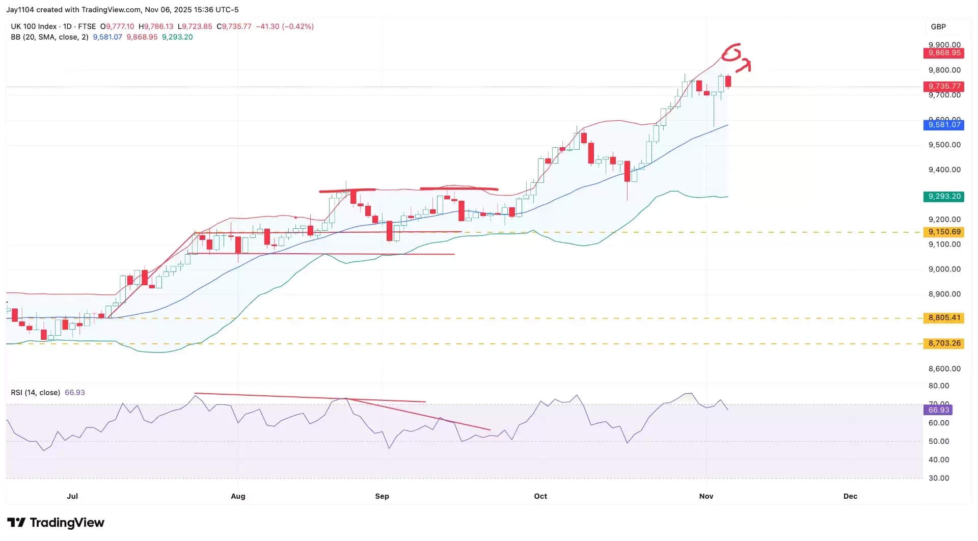 The FTSE 100 has already benefited from rising global commodity prices, which have supported the index’s recent rally. If economic growth improves, it could provide additional momentum, helping to drive the FTSE higher. At present, the index has been consolidating around 9,770 and appears well positioned to continue rising – possibly even moving towards 9,900 in the near term – if the outlook for growth brightens and worries over tax hikes subside.