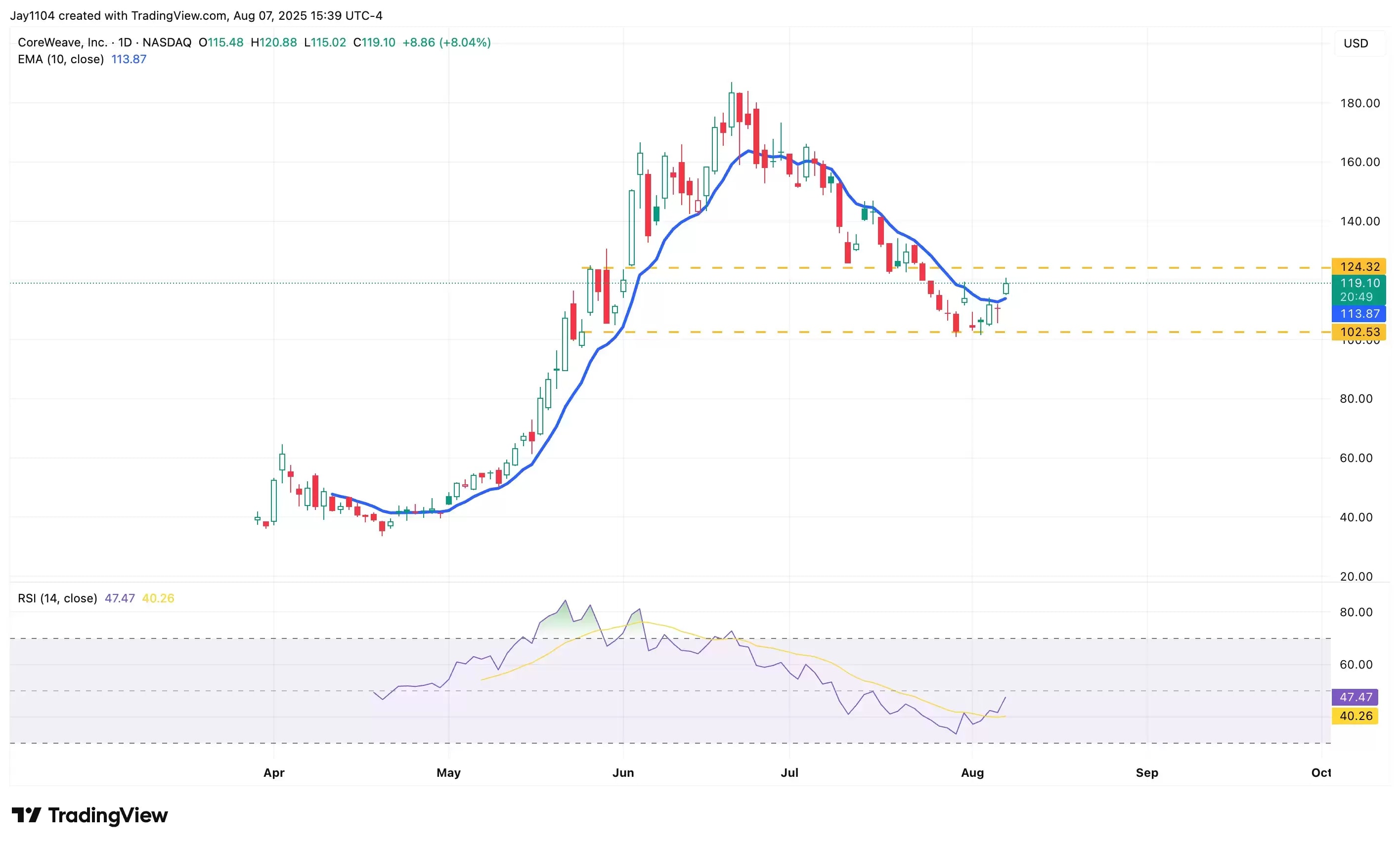 As the chart below illustrates, CoreWeave shares found support near $100 in late July and early August, and now appear to be gaining upward momentum. The stock has moved above its 10-day exponential moving average (the blue line), and the relative strength index – a closely watched momentum indicator – is also rising. If the shares break above resistance at $124, they could advance towards $147. However, should support at $100 fail, the shares may fall back towards $66.