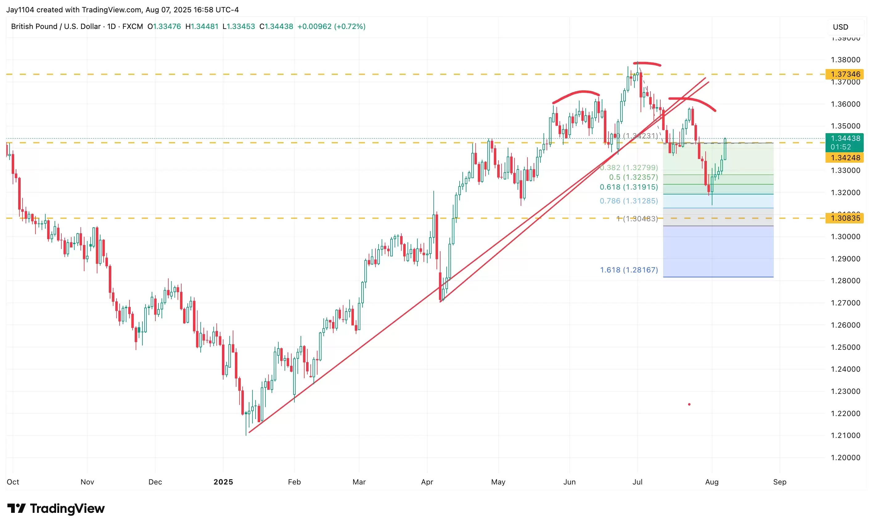 A case could be made that GBP/USD bottomed after hitting the 78.6% Fibonacci retracement level from the neckline of its recent head-and-shoulders pattern. Since that bottoming out, the pound has rebounded, breaking back above resistance at $1.345. Sterling could rise further if second-quarter GDP signals that the UK economy is strengthening.