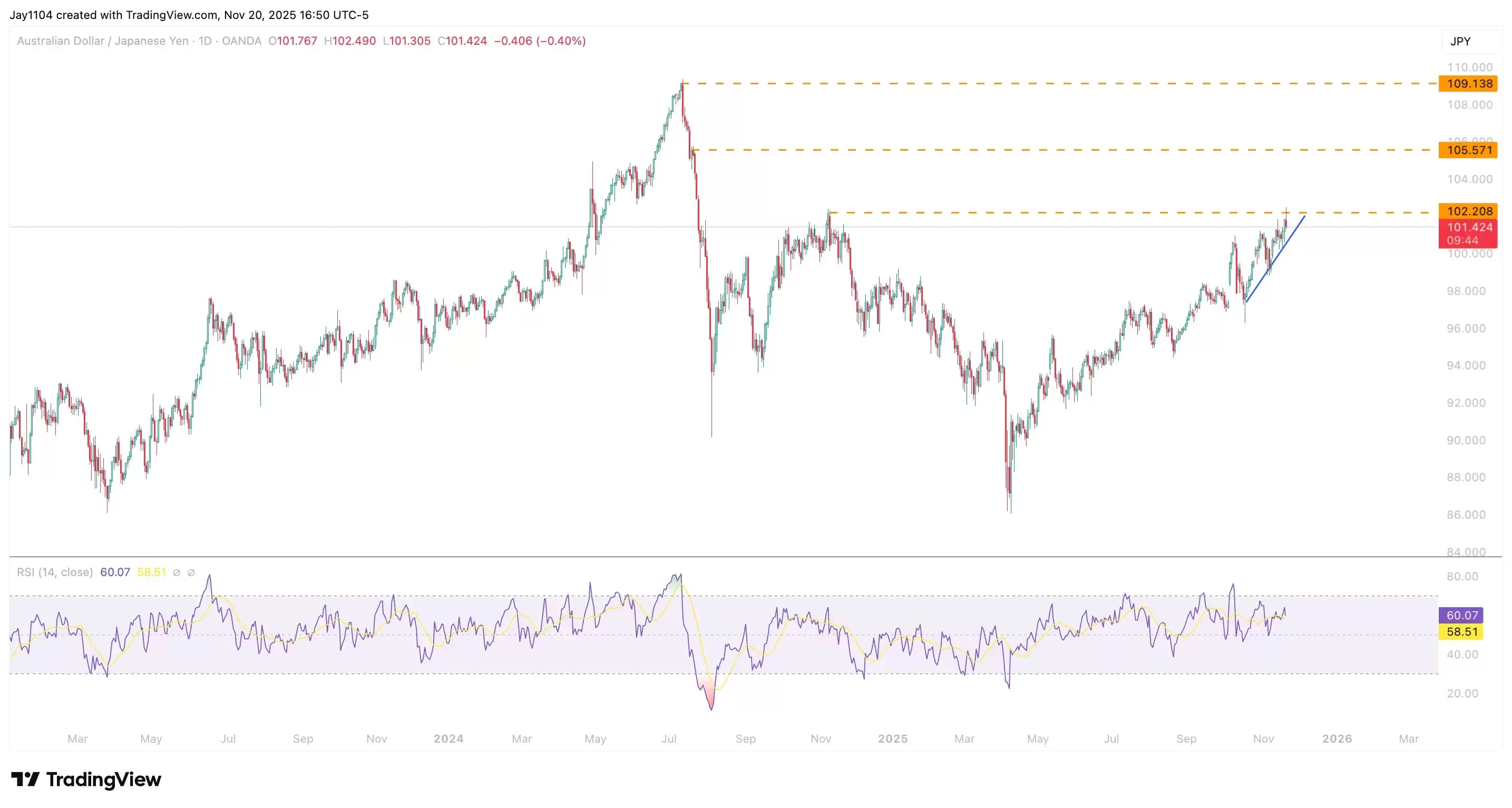 Currently, AUD/JPY is approaching a key resistance level around ¥102.50. If it breaks through that level, it could lead to a significant weakening of the yen, potentially sending the pair up towards ¥105.50.
