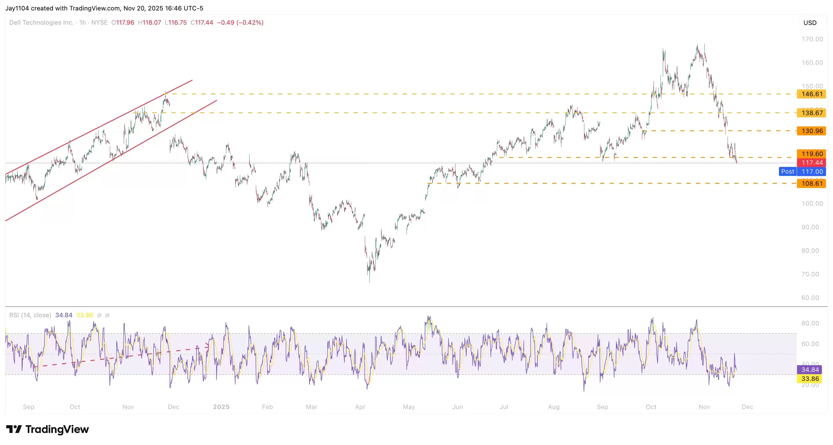 Options markets imply traders are expecting the technology firm’s share price to move by an average of 9.5% in either direction after the earnings announcement. Dell shares fell 1.7% on Thursday 20 November to end the day at $117.40. So far in 2025, the stock – which is a component of the Nasdaq 100 – has gained just 0.8%. But that essentially sideways shift could be about to take on a different shape.