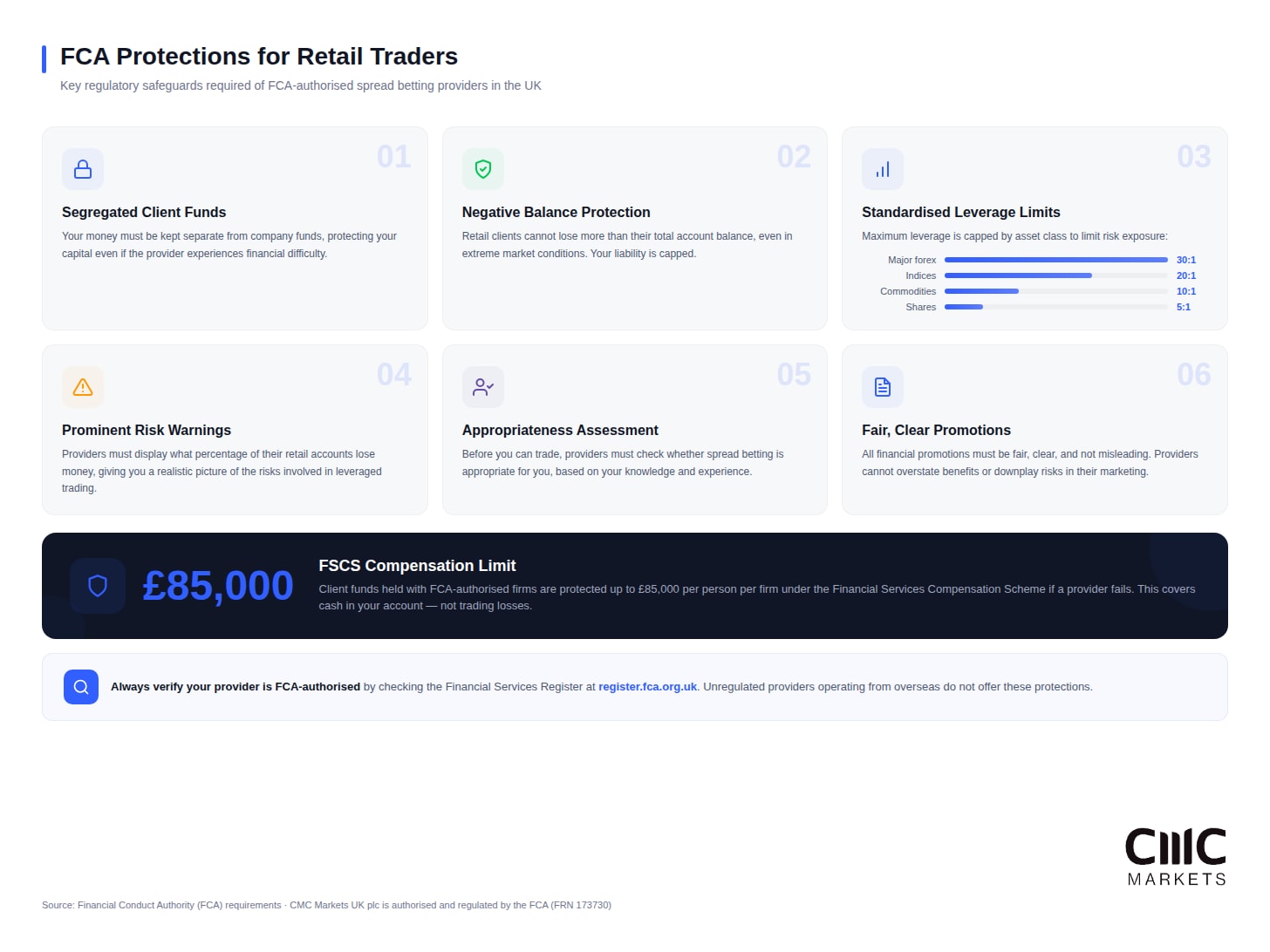 Client funds held with FCA-authorised firms are protected up to £85,000 under the Financial Services Compensation Scheme (FSCS) if a provider fails. This protection covers cash held in your account, not market losses from trading.