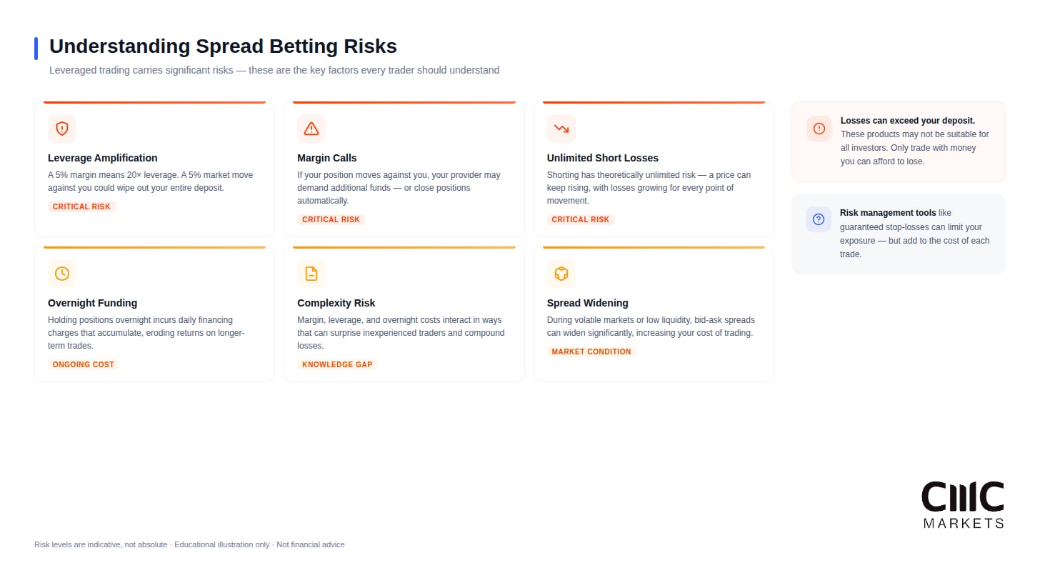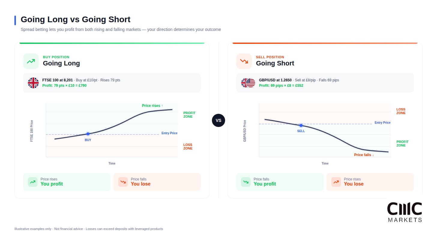 This flexibility distinguishes spread betting from traditional investing. In falling markets, you can potentially profit rather than simply watch holdings decline. However, short positions carry additional risks — prices can theoretically rise indefinitely.
