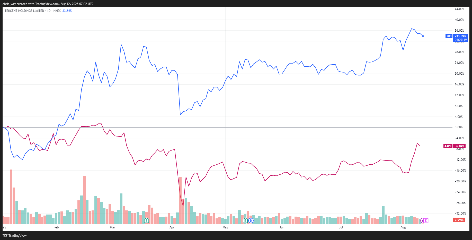 - Tencent: 24.97x P/E with 33.75% YTD gains vs.NVIDIA: 58.54x P/E with 31.63% YTD performance