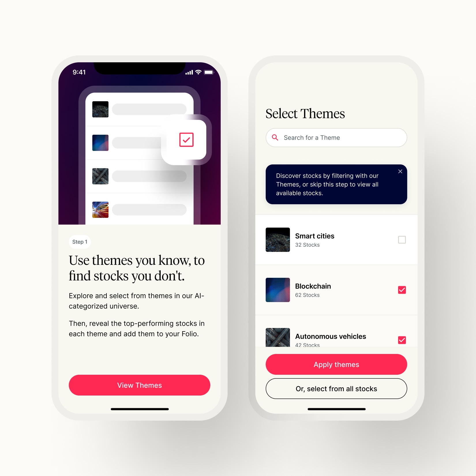 To get started, you will be asked to pick themes you are interested in. You can pick multiple themes, or opt to see all available stocks instead.