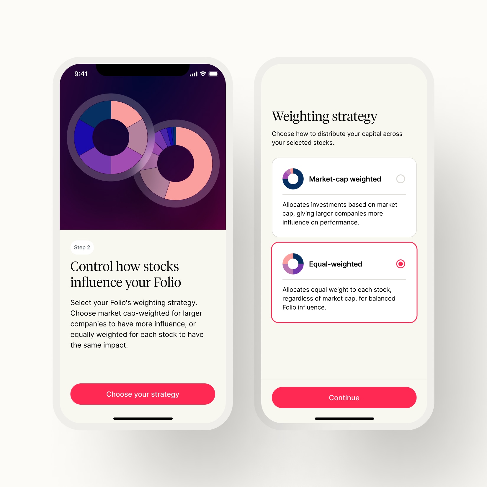 Next up, you will define your weighting strategy for the Folio. You can opt for market cap weighting, which gives larger companies more influence, or equal weighting, in which each of your selected stocks will have equal impact.