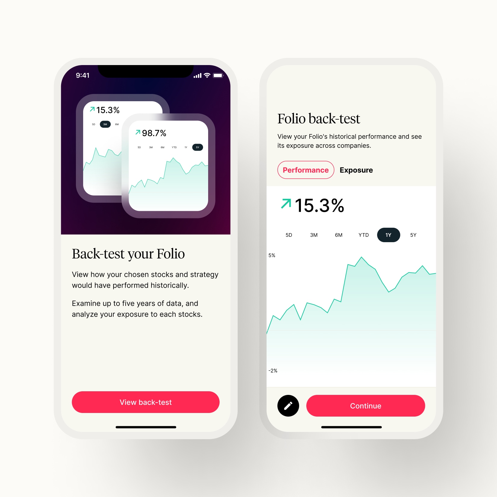 Within your chosen themes, you will be asked to pick a minimum of three stocks that you would like to invest in. In the selection screen, you will see each asset’s performance over a given timeframe: you can select between multiple periods, from one day to five years.