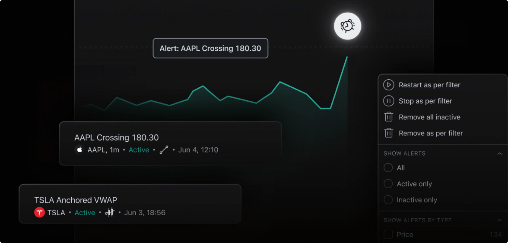 Set up personalised alerts using 13 built-in conditions based on price and volume.