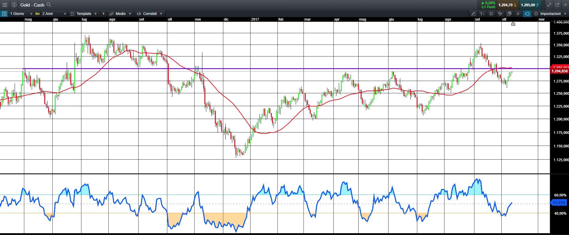 Se l’oro dovesse chiudere con una candela giornaliera sopra i 1300 possiamo attenderci un rialzo fino a 1325, mentre un ritracciamento sui 1300 potrebbe portare l’oro a tornare sul livello 1275.