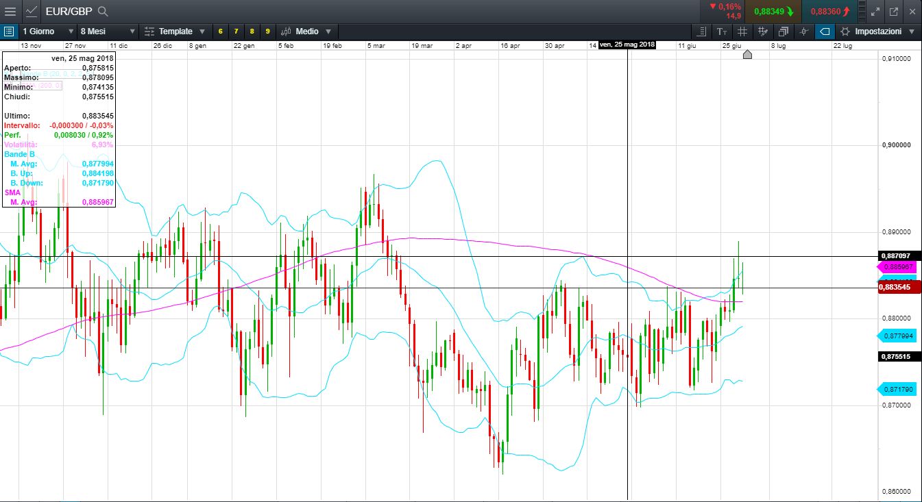EUR/GBP: nonostante ci siamo spostati oltre la media mobile a 200 periodi posizionata a 0.8820 sfiorando zona 0.8900, si è tornati fortemente all’indietro con la media mobile che ora funge da supporto che, se rotto può farci rivedere 0.8780 prima e zona 0.87 successivamente