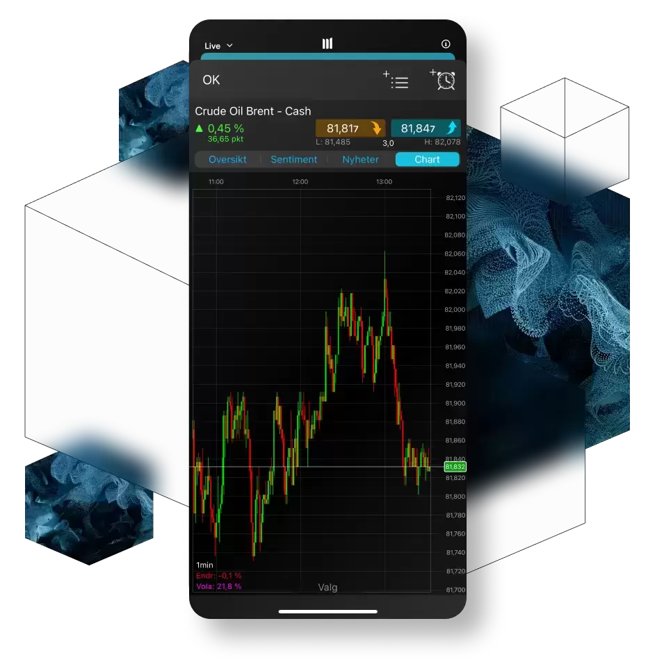 Du får funksjonalitetene til den nettbaserte plattformen rett i lomma. Åpne, lukk eller gjør endringer på posisjonene, sett opp varslinger og analyser mobil-optimaliserte charts i vår prisvinnende tradingapp2.