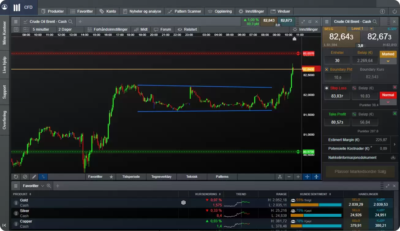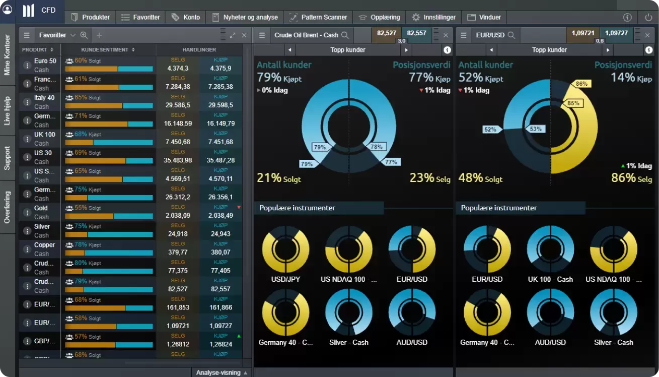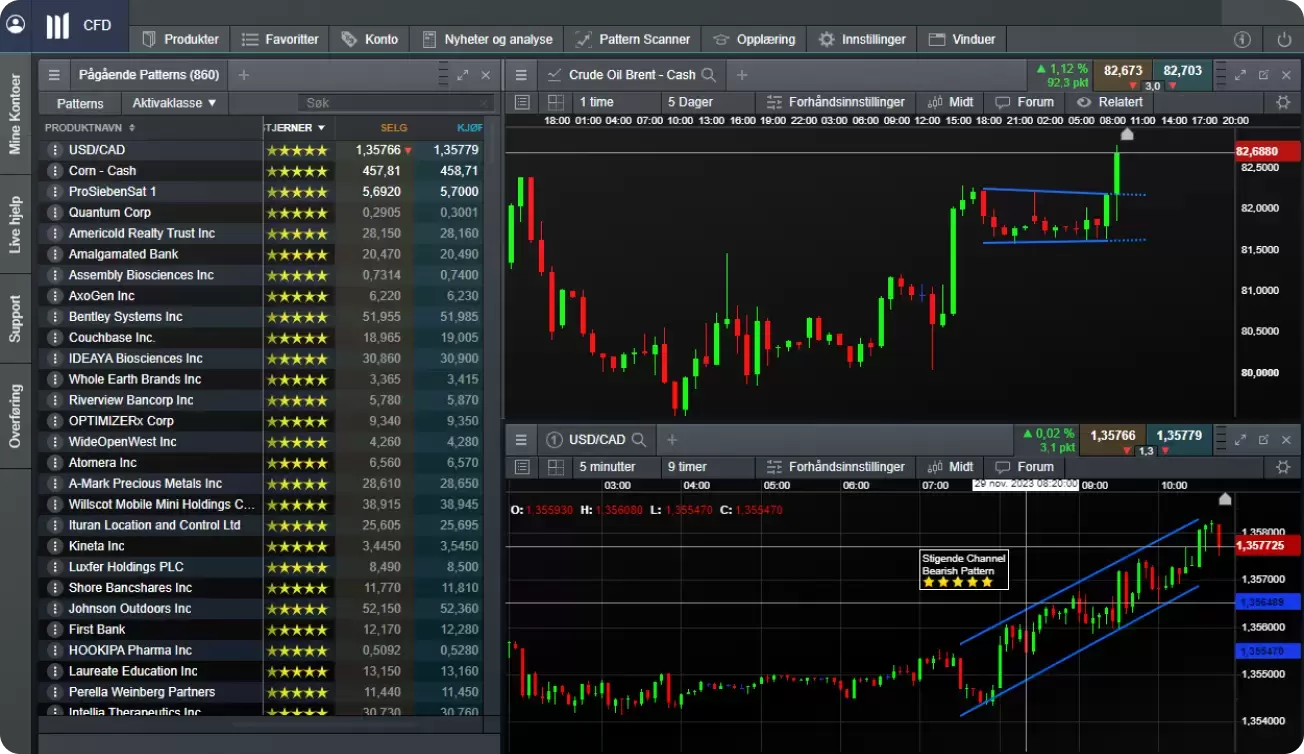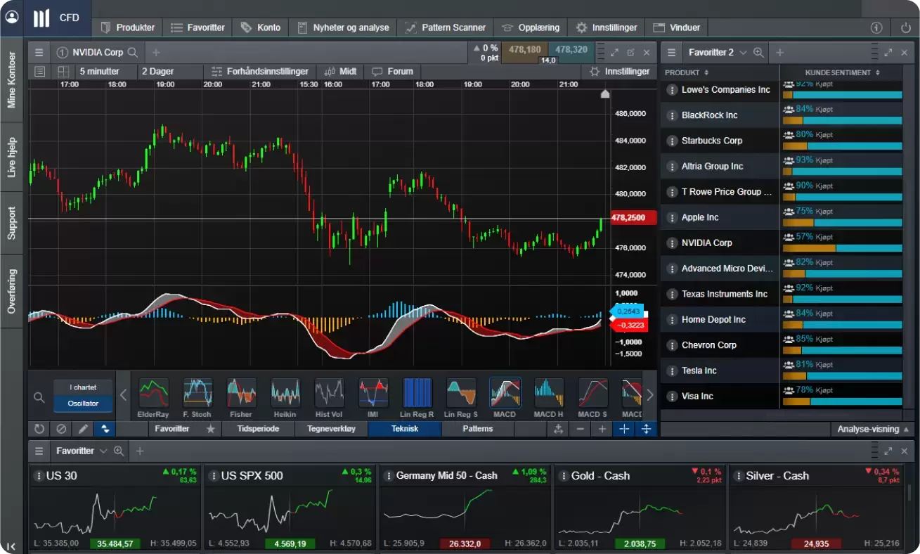 Vi har designet vår tradingplattform til å være funksjonsrik, men likevel intuitiv og enkel å bruke. Den har 115 indikatorer og tegneverktøy, pattern recognition scanner, kundesentiment og nyttige verktøy for risikostyring.