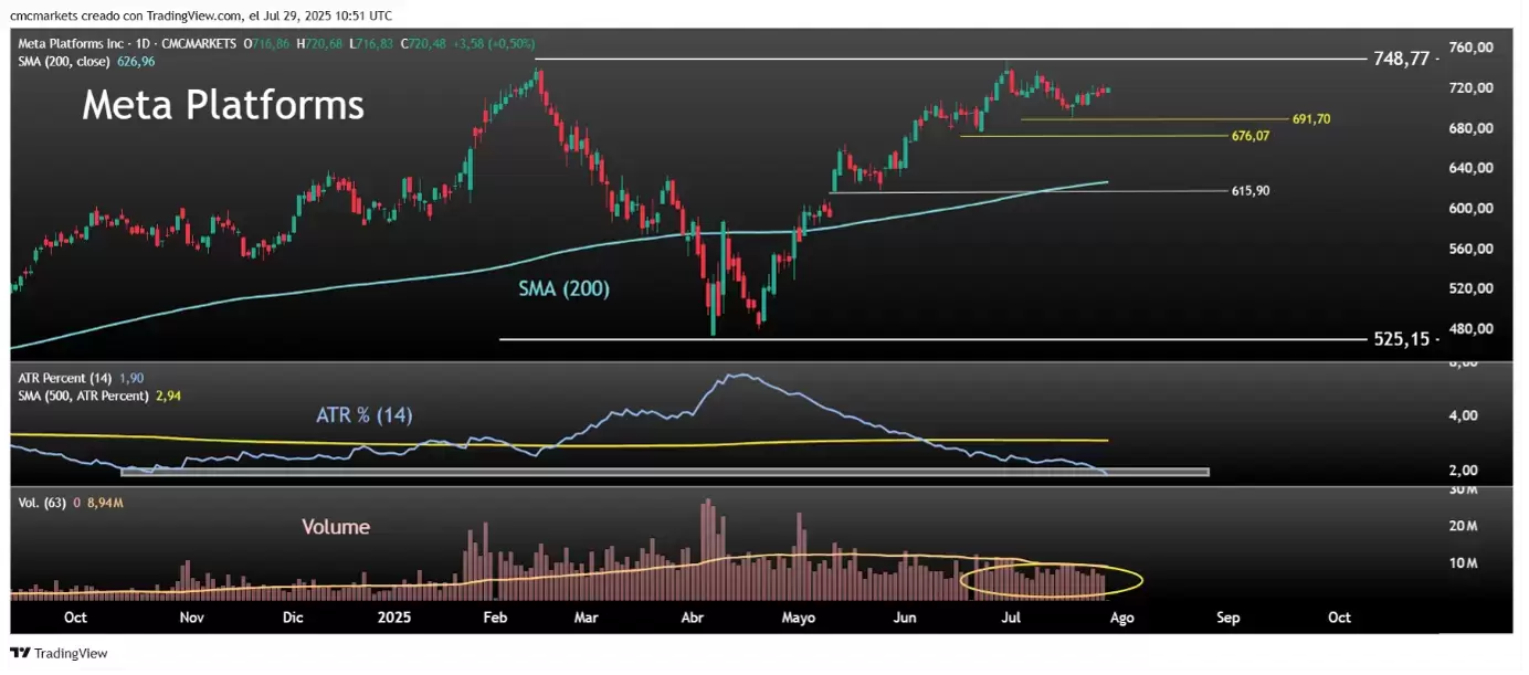 Meta Platforms i daglig chart med ATR % og volum. Kilde: TradingView, 29.07.25