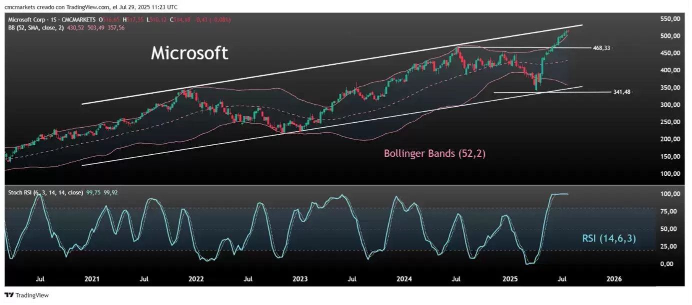 Microsoft i ukeschart med Bollinger-bånd og RSI. Kilde: TradingView, 29.07.25