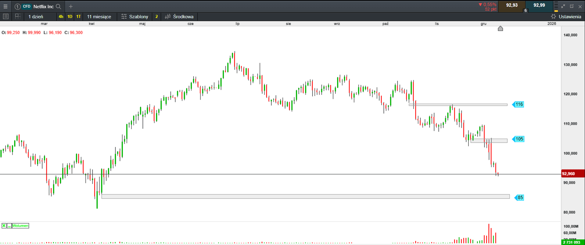 Aktualnie rynek skupia się na bitwie o Warner Bros. Discovery. Najpierw firma Netflix ogłosiła chęć kupna studiów i segmentu streamingowego WBD w transakcji wartej ok. 72–83 mld USD. Jednak zaledwie kilka dni później, Paramount Skydance wkroczyło z wrogą ofertą — oferując 30 USD za akcję płacąc gotówką, co wycenia WBD na około 108,4 mld USD, i proponując przejęcie całej firmy (studia, streaming, sieci kablowe). Taka oferta ma dotrzeć bezpośrednio do akcjonariuszy WBD, pomijając zarząd — to tzw. tender offer. Paramount argumentuje, że jego propozycja zapewnia bardziej pewny i szybszy proces finalizacji niż oferta Netflixa, a odzwierciedla pełną wartość obejmując też kanały kablowe, które Netflix chciał pozostawić poza transakcją. Wobec tej ofensywy Warner ma do 22 grudnia podjąć decyzję, czy uzna ofertę Paramount za lepszą i wejdzie z nim w negocjacje. W razie wycofania się z umowy z Netflixem, WBD musiałoby zapłacić Netflixowi karę umowną. Tym samym na horyzoncie może powstać największe wrogie przejęcie w historii, a ta potyczka ma kluczowe znaczenie dla przyszłości Hollywood — decydując o tym, jaka firma przejmie ogromne zasoby filmowe i telewizyjne WBD.