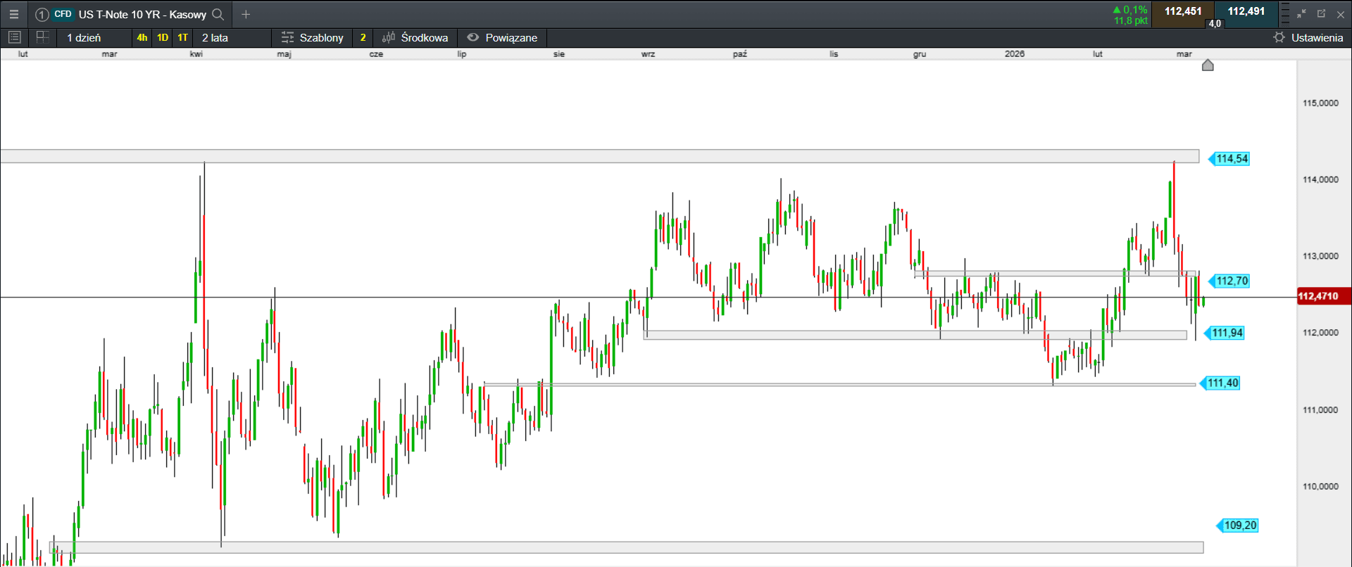 Również na Wall Street jest nerwowo. Fed jest na ten moment między młotem, a kowadłem, co do decyzji o stopach procentowych, ponieważ konflikt z Iranem podsyca obawy przed stagflacją. Mimo że przez prawie cały dzień handel odbywał się na plusie, to już końcówka sesji należała do sprzedających. Dow Jones stracił 0,07%, S&P 500 spadł o 0,21%, a Nasdaq 100 finiszował z zyskiem 0,01%.