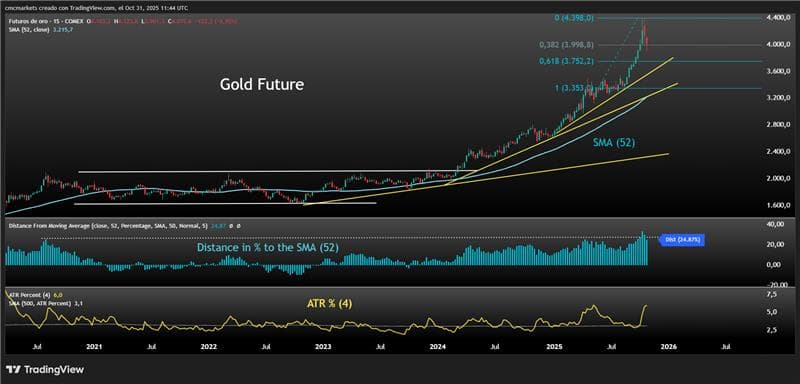 Kontrakty terminowe na złoto na wykresie tygodniowym pokazującym odległość od SMA (52) i ATR %. Żródło: TradingView, 31.10.2025 r.