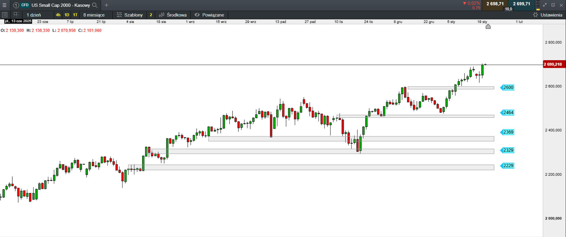 Na GPW bez zmian. Za nami dwa tygodnie poszukiwania przez WIG20 kierunku, gdzie rynek pozostaje w równowadze. Parkiet przy Książęcej wciąż wygląda prowzrostowo, choć ostatnie dziesięć sesji na WIG20 to poszukiwanie kierunku i przepychanka wokół poziomu 3260 pkt. Wczorajsza sesja była dość nerwową, podobnie jak na głównych giełdach europejskich co jest pokłosiem reakcji na straszenia Trumpa nałożeniem ceł na część krajów Europy. Dobrą wiadomością dla byków jest to, że udało się domknąć lukę spadkową z 8 stycznia i na początku handlu wspiąć się nowe roczne maksimum. Niestety tylko na krótką chwilę, a kontra niedźwiedź skutecznie zepchnęła indeks na niższe poziomy. Jest dużo za wcześnie by twierdzić, że optymizm na GPW po cichu wyparowuje. Niemniej należy być ostrożnym, ponieważ trwa zwieranie szeregów i jeden z obozów przechyli szalę zwycięstwa na swoją korzyść. Indeks WIG20 odnotowywał w styczniu niemal z sesji na sesję najwyższe poziomy od roku. Oczywiście, po tak dynamicznym wzroście, należy liczyć się z możliwością wystąpienia korekty w ramach realizacji solidnych zysków. Jednak dopiero trwały spadek poniżej minimum z 29 grudnia 2025 stanowi zagrożenie dla wzrostów i może spowodować większe cofnięcia w stronę poziomu 2378 pkt. Jednak obserwowane od kilku dni pogorszenie nastrojów na Wall Street może odcisnąć swoje piętno. Po neutralnym otwarciu i wyprzedaży w pierwszej połowie dnia, pojawił się popyt po tym jak w Davos Trump zapewnił, że nie użyje siłowego przejęcia Grenlandii. To wyciągnęło WIG20 w okolice otwarcia.