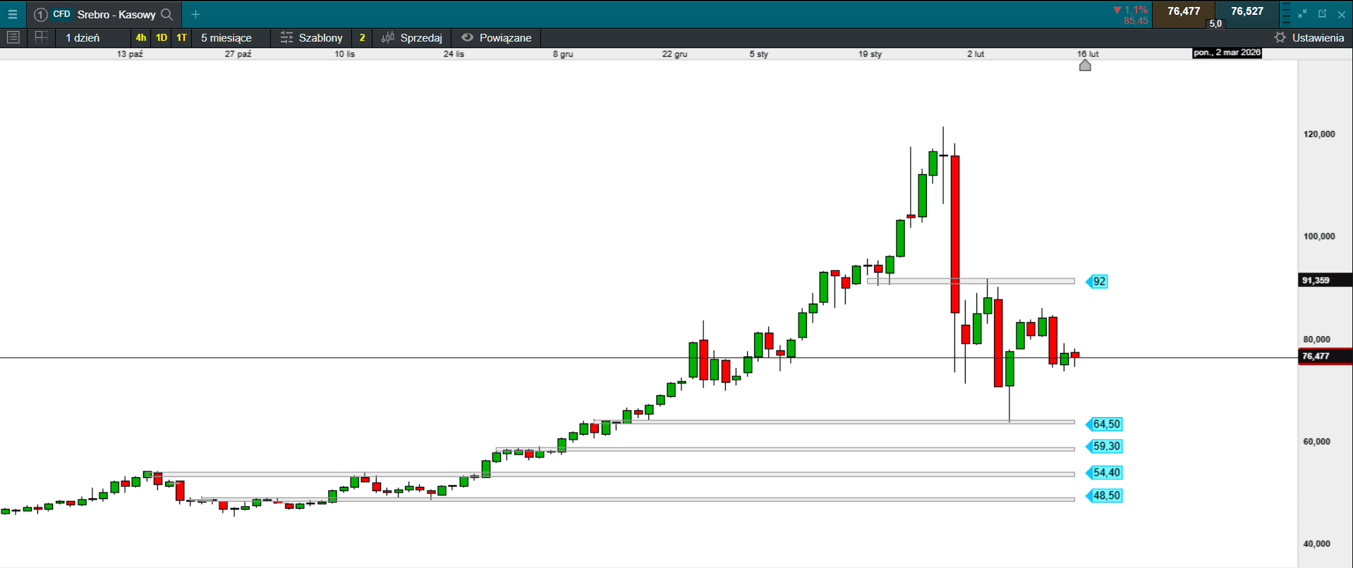 Kontrakty terminowe na srebro na giełdzie Nymex spadły w piątek rano do 74 dolarów za uncję, po czym odrobiły część zysków, a jego cena wzrosła 78 dolarów. Wśród szeregu propozycji przedstawionych administracji Trumpa przez Rosję znalazły się oferty współpracy w zakresie wydobycia paliw kopalnych, joint venture w projektach gazu ziemnego oraz partnerstwa offshore w zakresie ropy naftowej i kluczowych minerałów. Jednak to, co przykuło uwagę traderów surowcowych, wyczulonych na gwałtowne wahania nastrojów, to sugestia, że Rosja może powrócić do dolara. Chociaż Rosja jest tylko jednym z kilku krajów, w tym Chin i Indii, które rozważają zmniejszenie zależności od dolara w handlu międzynarodowym, możliwość odwilży w stosunkach rosyjsko-amerykańskich wystarczyła, aby wywołać kolejną falę realizacji zysków i likwidacji długich pozycji w srebrze. Chociaż żadna ze stron nie potwierdziła oficjalnie tych propozycji, nastroje są obecnie tak zmienne, że na rynku srebra obserwuje się tak dużą aktywność spekulacyjną, zwłaszcza w Azji, a każdy napływ informacji ma przesadny wpływ na cenę. Choć przedstawiana propozycja nie potwierdzi przyszłej amerykańskiej hegemonii finansowej, tak jak wcześniejsze działania Rosji na rzecz dywersyfikacji nie zagroziły jej końcowi, nie ma wątpliwości, że zakończenie konfliktu na Ukrainie zmniejszyłoby część geopolitycznych turbulencji, które napędzały wzrost cen metali szlachetnych.