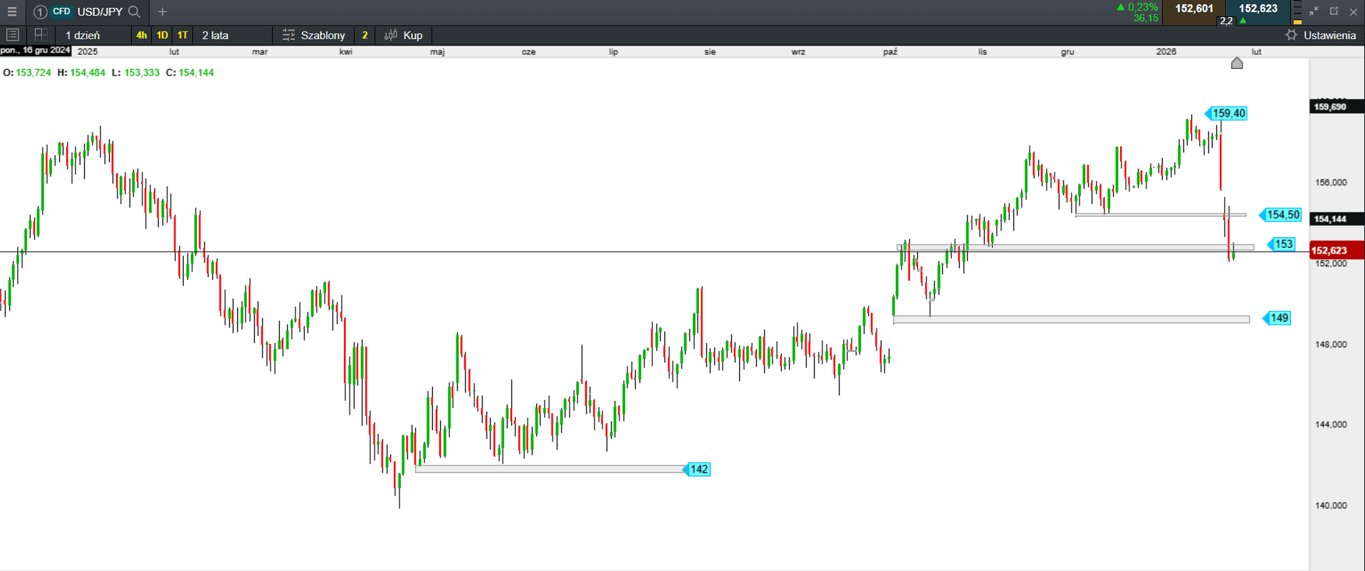 Jaka jest motywacja Japonii? Władze Japonii obawiają się, że słabszy jen może spowodować wzrost cen importu. Kraj w dużej mierze opiera na imporcie podstawowych dóbr, takich jak energia i żywność. Obawy te wysuwały się na pierwszy plan w ostatnich dniach, gdy Takaichi prowadzi kampanię przed przedterminowymi wyborami, które ogłosiła na początku lutego. Jej Partia Liberalno-Demokratyczna obiecuje kosztowny program fiskalny, który mógłby pogłębić i tak już wysokie obciążenie Japonii długiem. Perspektywa ta ograniczyła popyt na japońskie obligacje rządowe i groziła spadkiem wartości jena. Japonia interweniowała na rynku w 2024 r., gdy jen osłabił się do podobnego poziomu.