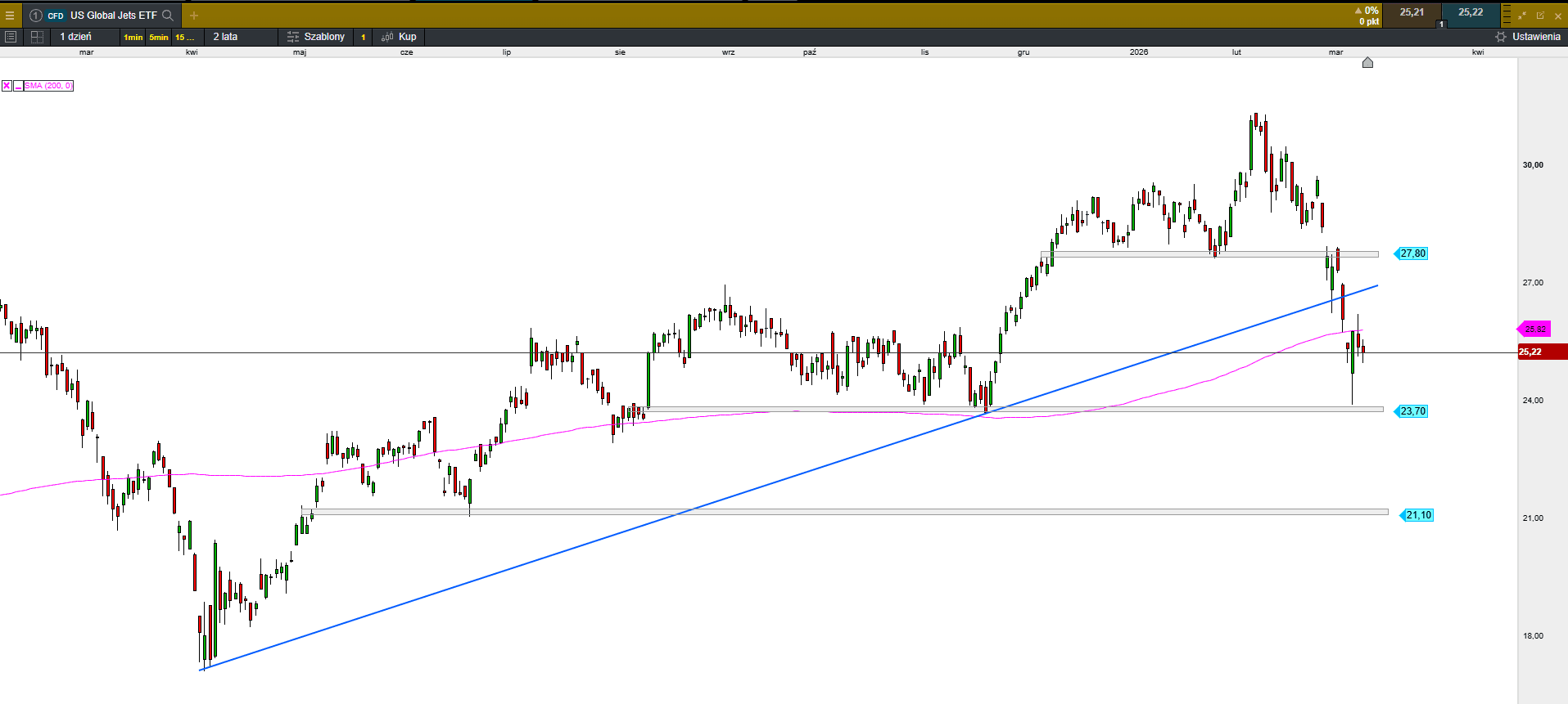 Głównym instrumentem obrazującym kondycję sektora jest fundusz US Global Jets ETF. Analiza wskazuje na kilka krytycznych momentów. Są to - przełamanie linii trendu wzrostowego: ETF spadł poniżej linii trendu, która wspierała wzrosty od kwietnia 2025 roku. Kolejny niepokojący sygnał to spadek poniżej 200-dniowej średniej kroczącej. Po raz pierwszy od sierpnia US Global Jets ETF zamknął się poniżej kluczowej granicy 25,88 USD. Próby powrotu powyżej tej średniej w ostatnich dniach zakończyły się niepowodzeniem, co technicy interpretują jako zamianę dotychczasowego wsparcia w opór. I wreszcie gwałtowna korekta. Od szczytu z 6 lutego ETF spadł już o blisko 18,6%, a tylko w marcu stracił ponad 10%.