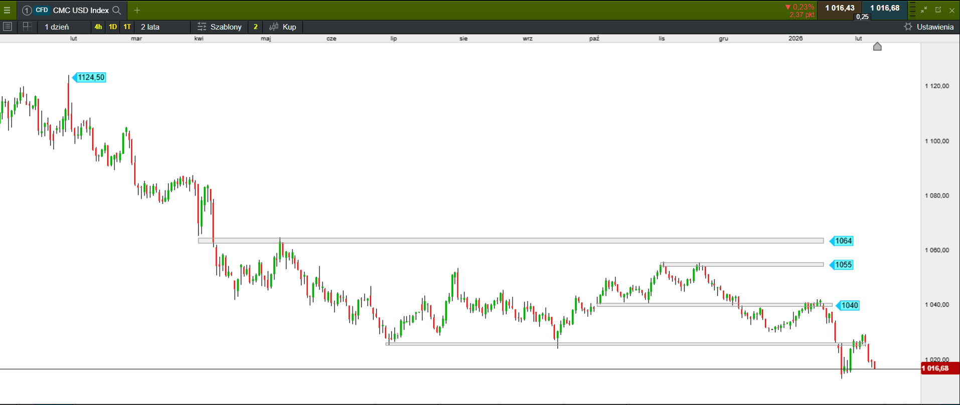 Na parkiecie przy Książęcej zrobiło się nerwowo. Już piątkowa i wcześniejsze sesje pokazały, że sytuacja na GPW jest mocno dynamiczna i pojawiają się pierwsze oznaki możliwej krótkiej korekty. Popyt, który dyktował warunki gry, stał się bardziej wybiórczy. Przez kilka dni na WIG20 trwa przepychanka, chociaż indeks wciąż radzi sobie bardzo dobrze, co było pokłosiem reakcji na decyzję Trumpa o odwołaniu karnych ceł na część krajów Europy. Niestety pogorszenie nastrojów na głównych parkietach Europy i na Wall Street zrobiło swoje. Obóz niedźwiedzi, który twierdził, że optymizm na GPW po cichu wyparowuje, może mieć rację, a realizacja zysków z długich pozycji dodatkowo może sprzyjać cofnięciu. Zatem należy być ostrożnym. Nasz parkiet nie jest oderwany od reszty świata i jeśli na globalnych parkietach pojawi się sceptycyzm, należy liczyć się z korektą, tym bardziej po tak dynamicznym wzroście. Jednak dopiero trwały spadek poniżej minimum z 29 grudnia 2025 stanowi zagrożenie dla wzrostów i może spowodować większe cofnięcia w stronę poziomu 2378 pkt. Wczoraj po niskim otwarciu i próbie powrotu nad kreskę, benchmark po godzinie handlu zaczął tracić, a próby odbicia kończyły się kontrą sprzedających. Ostatecznie WIG20 finiszował na dziennym minimum.