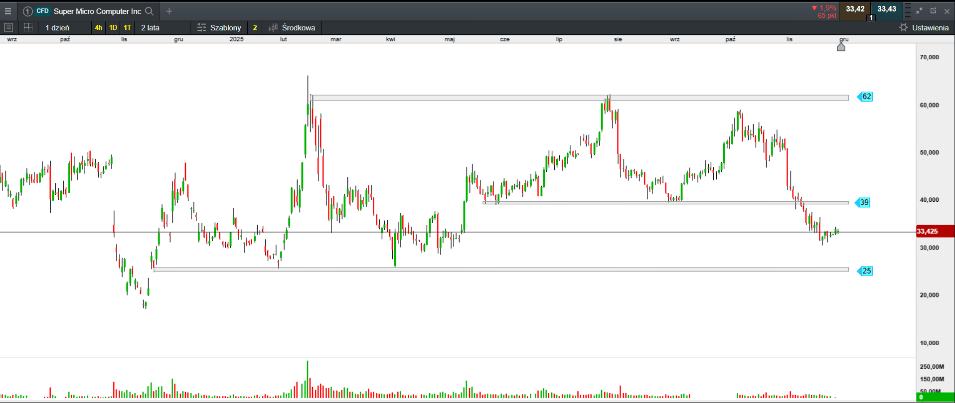 Listopad nie był dobrym miesiącem dla inwestujących w spółki związane ze sztuczną inteligencją. W obliczu “kryzysu” na rynku sztucznej inteligencji, akcje głównych spółek technologicznych odnotowały miesięczne spadki sięgające nawet 37%. Aż 63 z 84 największych spółek technologicznych odnotowało miesięczne spadki. Wśród największych przegranych znajdują się dawni ulubieńcy sztucznej inteligencji, którzy stracili swój blask. Najlepszym przykładem jest Super Micro Computer, którego akcje odnotowały spadek o 36,8%. Producent serwerów nadal odnotowuje rosnący popyt na sztuczną inteligencję, ale jego marże znalazły się pod presją silnej konkurencji i rosnących kosztów. Akcje spółki gwałtownie spadły po ogłoszeniu wyników. Pomimo, że firma podniosła prognozę przychodów na cały rok do co najmniej 36 miliardów dolarów, z poprzedniej prognozy na poziomie co najmniej 33 miliardów dolarów, akcje spadły powodu presji na marżę, przy marży brutto na poziomie 9,3% w trzecim kwartale. Choć kiedyś Super Micro korzystało z rosnącego popytu na serwery AI, obecnie rynek stał się bardziej konkurencyjny i zuniformizowany, co wpłynęło na rentowność.