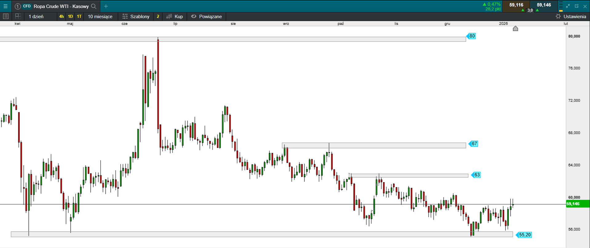 Parkiet przy Książęcej wciąż wygląda prowzrostowo. piątkowy handel wybił z głowy niedźwiedzi pomysł grania “pod prąd” i dużo za wcześnie twierdzić, że optymizm na GPW wyparował. Czwartkowe potknięcie należy raczej rozpatrywać jako naturalną korektę dynamicznej fali wzrostowej, a sprzedający chcąc kontynuacji przeceny, po godzinie notowań musieli zweryfikować swoje podejście. Indeks WIG20 odnotowywał w styczniu z sesji na sesję najwyższe poziomy od roku. Póki co można było oczekiwać, że czwartkowy handel raczej był to tylko przystanek w dalszym marszu na północ i tak też się stało. Oczywiście, po tak dynamicznym wzroście, należy liczyć się z możliwością wystąpienia korekty w ramach realizacji solidnych zysków. Jednak dopiero trwały spadek poniżej minimum z 29 grudnia 2025 stanowi zagrożenia dla zatrzymanie wzrostu i może spowodować większe cofnięcia w stronę poziomu 2378 pkt. Wczoraj po wzrostowym otwarciu i próbie sprowadzenia indeksu pod kreskę, kontra byków wyciągnęła WIG20 na zielone terytorium. Ostatecznie WIG20 zamknął się na poziomie dziennego minimum.